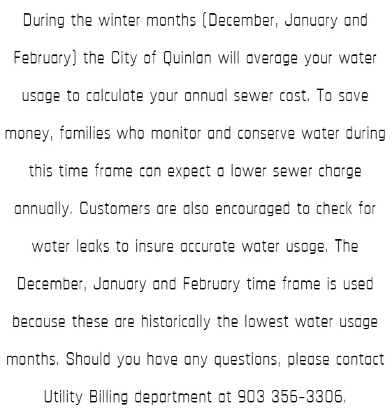 Water and Sewer Rates are set by City of Quinlan's Code of Ordinance 2017-02-03, adopted 02/13/2017. For detailed information regarding the water and sewer rates ordinance, click here.